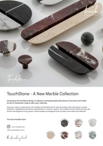 TouchStone - A New Marble Collection Touch_Handles_Aus Introducing, the TouchStone Range. A collection encompassing beautiful pieces of raw stone and marble turned art statements ready to adorn your cabinetry. Coming in seven unique stones, the marbles stand testament to natures artistry, with each piece a unique statement. Highlighting the perfect imperfections in natures creation, the sculptural forms & bold veining, add texture and elegance to any space. These handles are designed to be touched, and made to be admired. The Touch Handles Team Black Marquina Calacatta Viola Super White Rosso Levanto Roman Travertine Carrara White Verda Green www.touchhandles.com.au